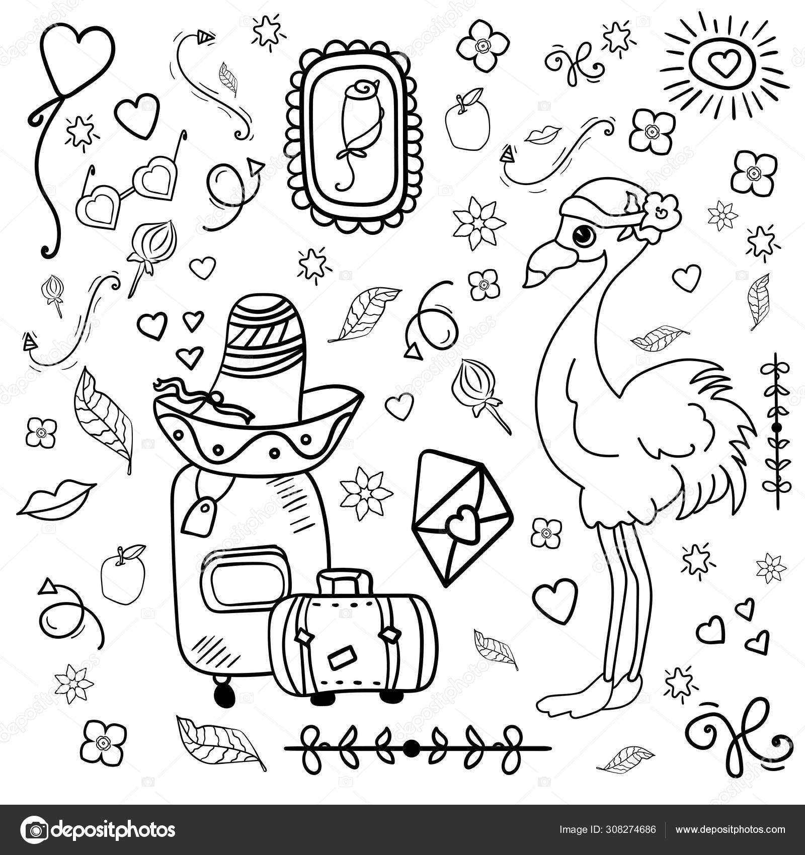 Flamingo Traveler Set Of Colorful Doodle On Background Coloring